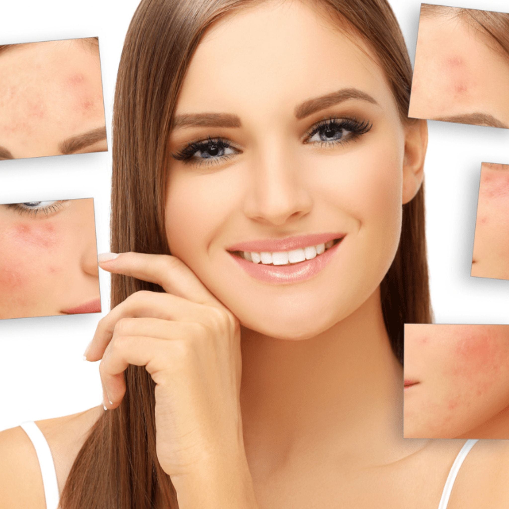 Close-up of a smiling girl with clear, radiant skin, pointing to snippets of her previous pimpled complexion, showcasing the effective transformation achieved with natural skincare solutions.